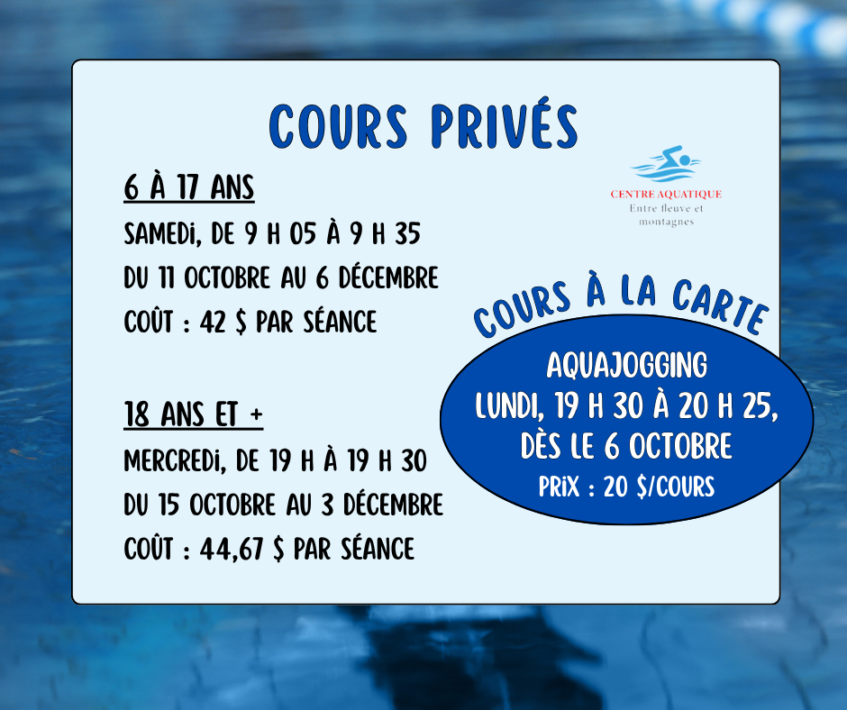 Aucun remboursement possible, sauf si annulation fait par le Centre aquatique pour des raisons de qualité d'eau, bris d'équipement, ou toute autre situation hors de notre contrôle.