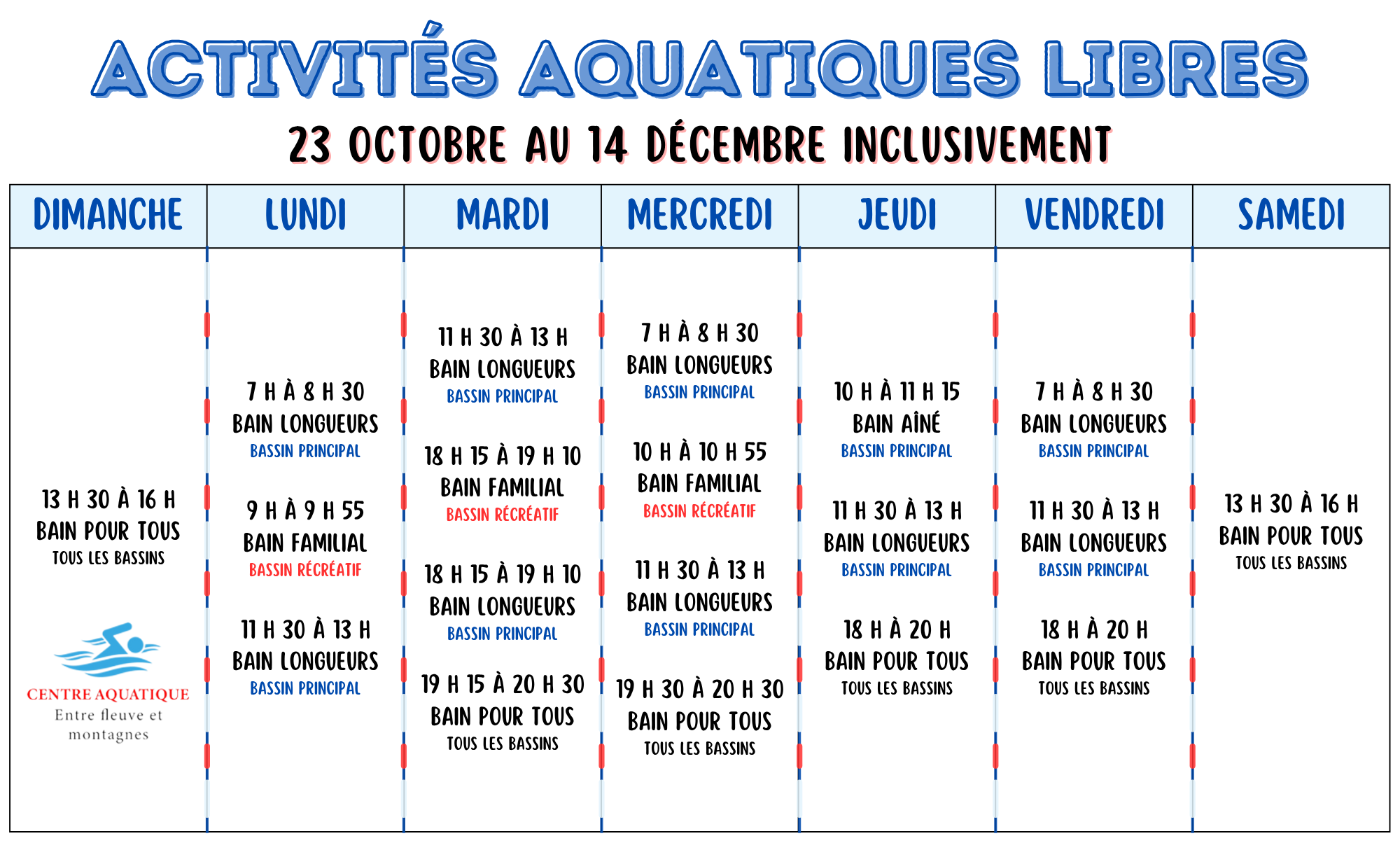 - 29 novembre 13 h 30 à 16 h – bain pour tous annulé en raison de l'examen Croix de bronze et requalification Moniteur en natation