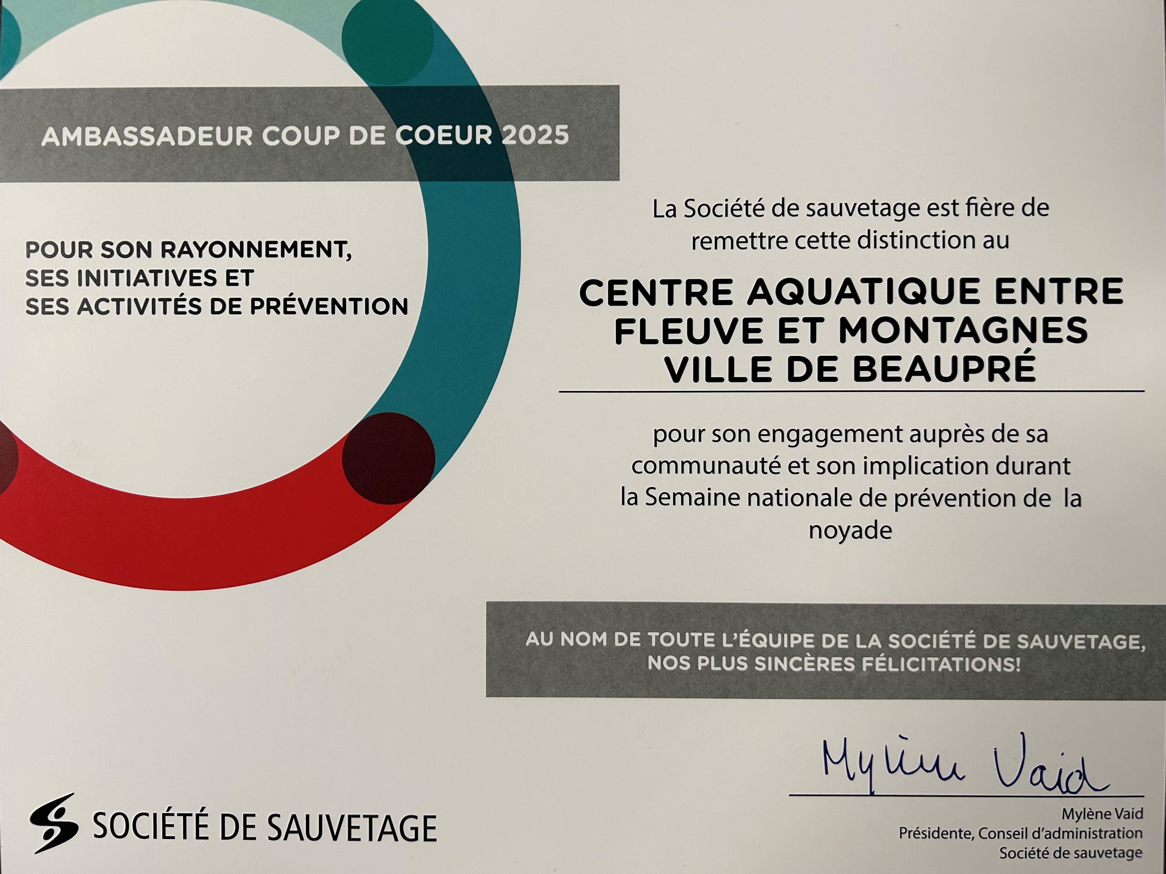 Le 6 septembre, notre organisation a été mise à l’honneur lors du banquet de la Société de sauvetage. L’équipe du CAFM s’est vu remettre un certificat honorifique pour son engagement remarquable durant la Semaine nationale de prévention de la noyade, qui s’est déroulée du 20 au 26 juillet 2025.